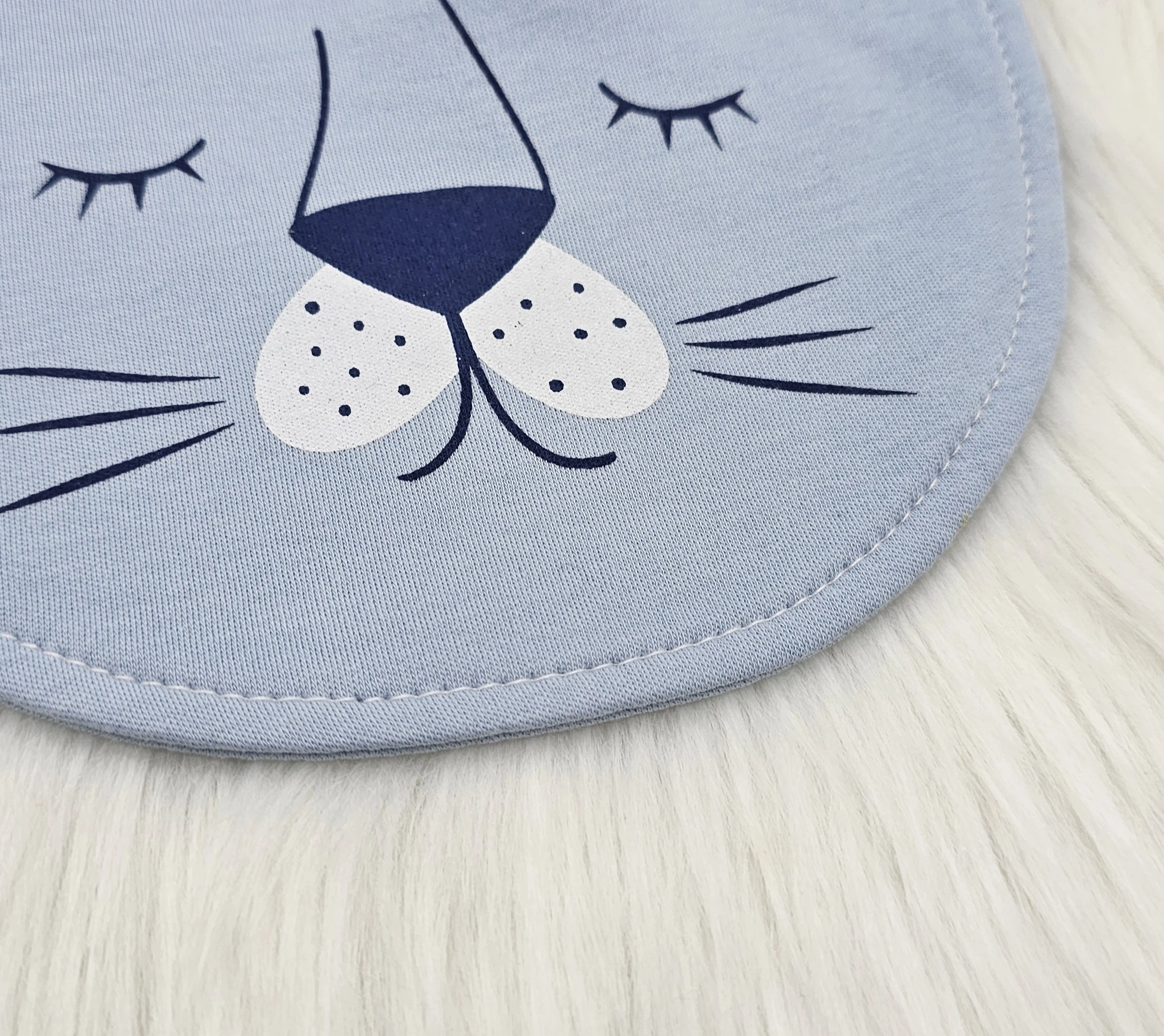 تأخذ المريلات شكل وجه حيوان لطيف بعيون مغلقة وشوارب مرسومة، مع آذان بارزة لتصميم جذاب.
