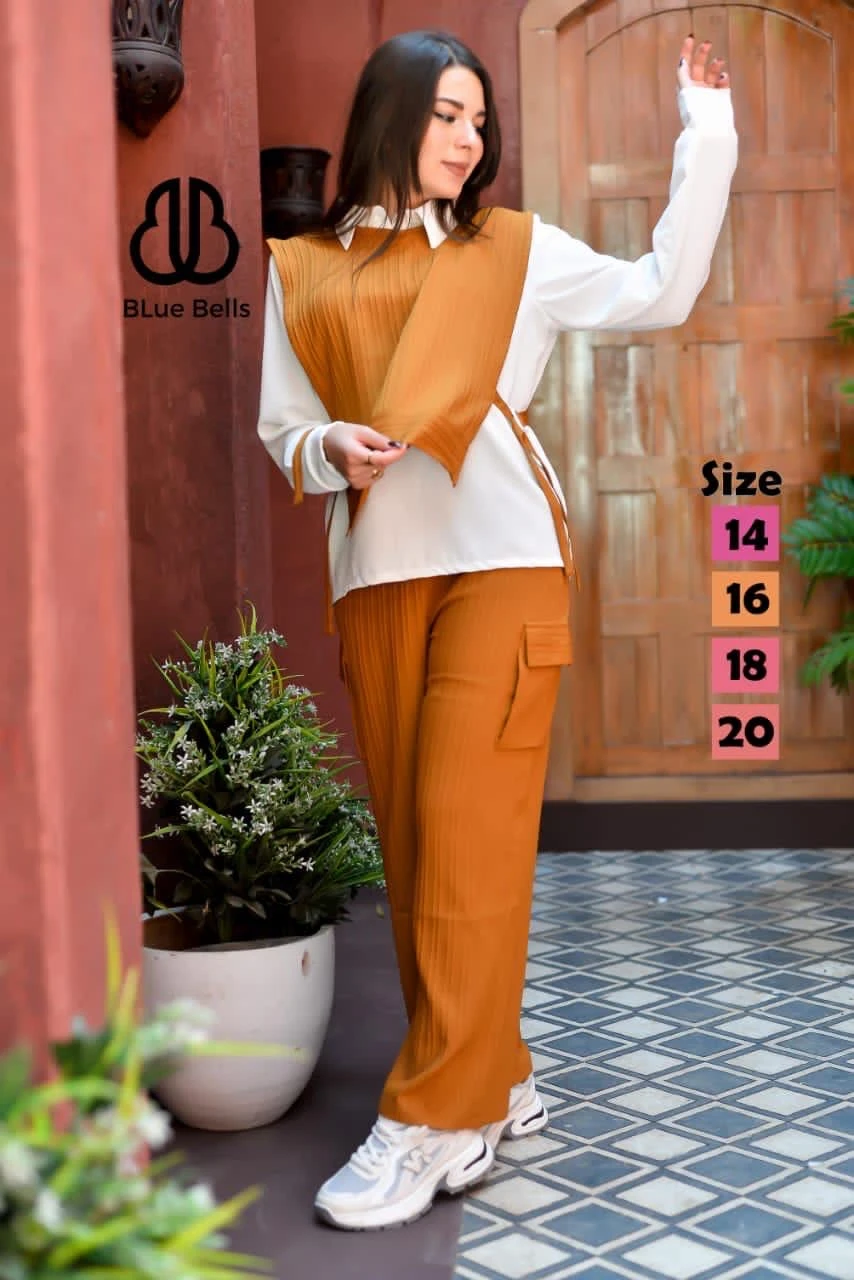 يتكون من بلوزة بدون أكمام بتصميم بليسيه أنيق وسروال واسع بقصة مستقيمة وجيوب جانبية عملية،